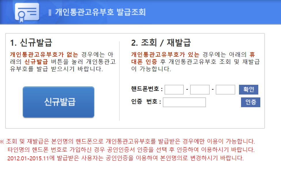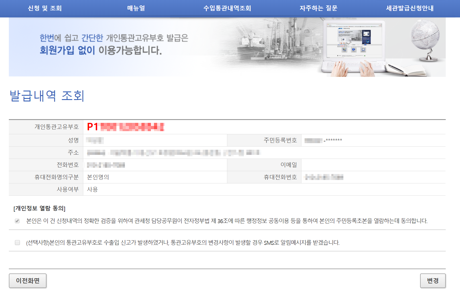 발급을 하신다면 이름, 주소, 주민번호, 전화번호만 입력하면 바로 통관부호를 받아볼 수 있습니다