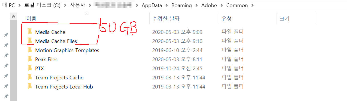 따라서 내가 설치한 App의 용량을 확인 하다보니, 제 경우에는 영상 편집프로그램인 Premier pro(프리미어프로) 캐시 파일이었습니다