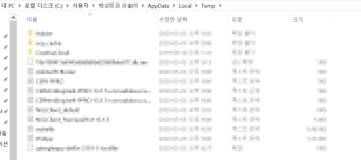 c드라이브 -> 사용자(or User) -> 사용자이름 -> Appdata -> Local -> Temp