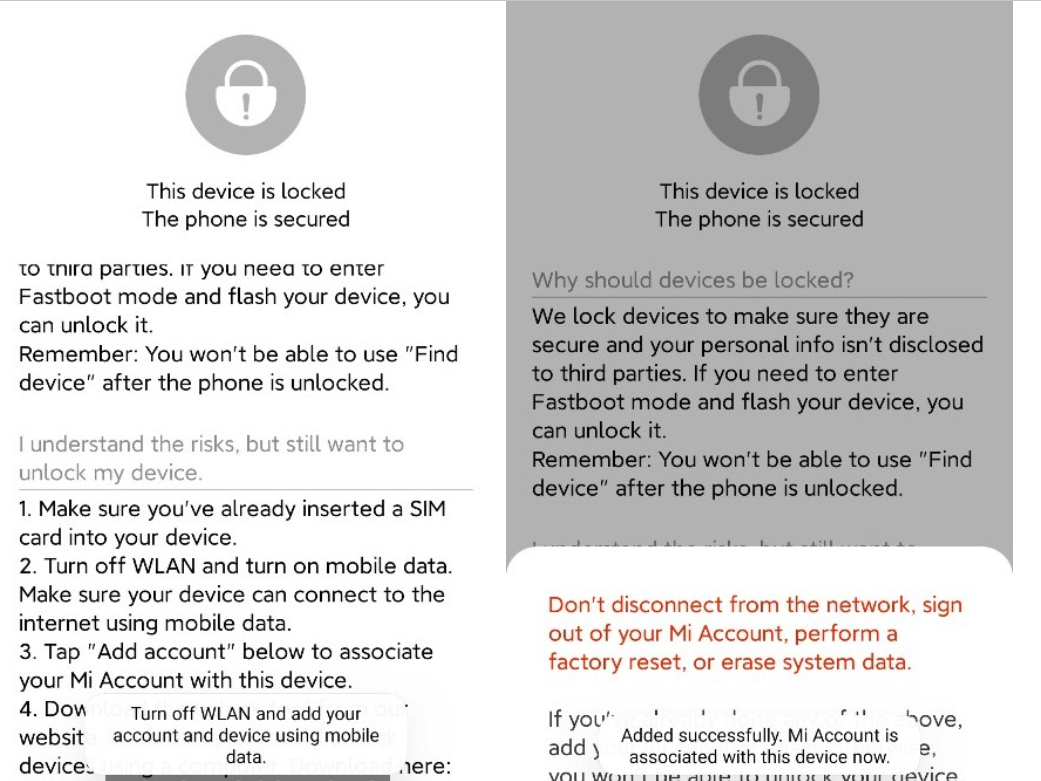 'unlock the phone will erase all phone data, whether to continue to unlock the phone?' 'An unlocked device is an easy target for malware which may damage your device or cause financual loss'
